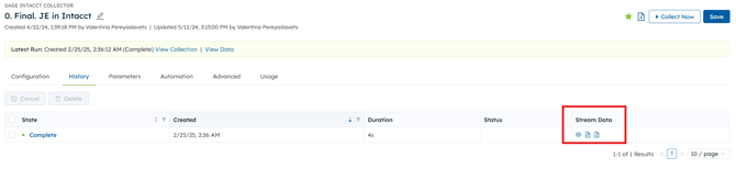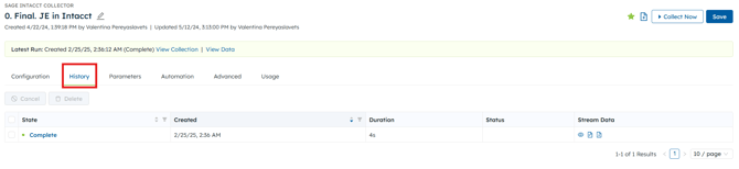 Under the History tab you can view all runs the collector had. You can filter the History by State or Created. You can also change the page or the number of results that are displayed on each page.
