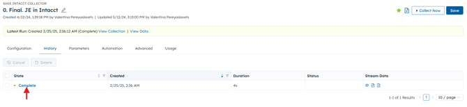 You can click ‘Complete’ or the State of the run to view the Logs, get a Data Preview, see what Items were collected, and what Parameters were used for a specific run.