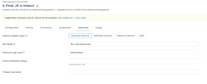 The Advanced tab allows you to choose how each run updates the schema, the Run Mode, the Minimum Log Level, how long the history of runs is kept, the amount of time the collector runs before timing out, and the schedule to run it on.